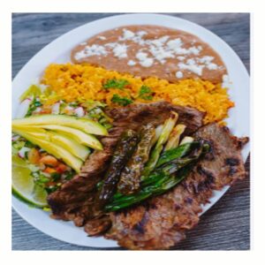 Carne asada con Arroz frijoles y ensalada una quesadilla choriso frito